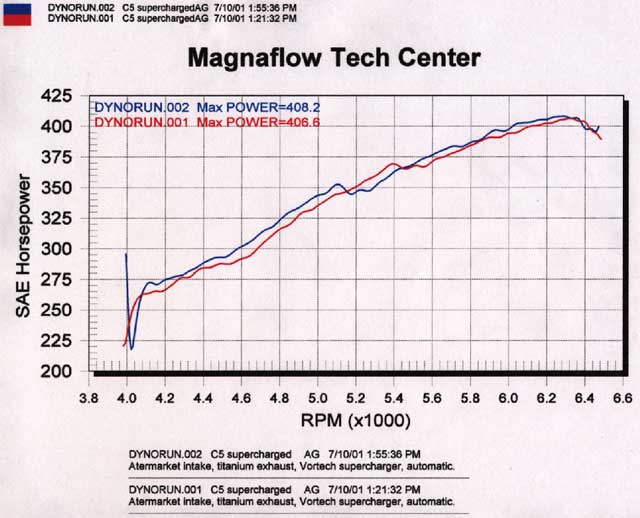 7\13\01: Allot happened since my last update. The supercharger was installed after many hours of knuckle scrapes and pushing and pulling. I have to say I wouldn't recommend it to anyone in a hurry or without 40+ hours of time to spare to install it. The results of course made the whole thing worth it, its fast as hell. However after just 2 days of racing around the city the transmission started slipping very badly (yeah I know, ha ha). With just over 10,000 miles the stock transmission was toast. I can't say I was totally surprised but one never looks forward to the cost of repair and downtime involved. I had a choice of what to do about the transmission. A: Attempt to get GM to replace it under warranty or B: Spend the money and built it right. I decided on B: because replacing the transmission with another stock one would eventually lead to the same result. Not to mention making GM pay for something that was obviously my doing didn't sit well. Although I do think GM owe's me a little something for all the money I've given them in five 4T65-E transmissions and only covering one of them under warrantee. So the search went on for placing offering build up kits for the 4L60-E. Needless to say the transmission in the C5 is allot more common in high performance applications then the front wheel drive GTP transmission. I was practically finding builders on every corner in Southern California ready and willing to build it up. After searching the net and hearing excellent things I bit my tongue and went to a company I've had NOTHING but problems with in the past to get a performance kit to build the transmission up with. This wasn't a easy decision but after researching allot of clients I went with Level10 in Hamburg NJ for a rebuild kit and performance billet torque converter. Having never worked on a RWD transmission I opted to pay someone who knew what they where doing to remove and repair the transmission and re-install it. I'm very glad I did after seeing everything involved to do the work. It damn near requires a car lift because the whole rear end subframe is dropped out in the process. Adding to the difficulty is the C5's unique rear mounted transmission rather then engine mounted a 5 inch metal matrix torque tube transfers the power to the rear mounted transmission/differential. Its done this way to maintain a almost exact 50/50 weight ratio for the front and rear to improve handling. When researching transmission shops I opted to go with one who had done a fair amount of the transmissions before but had the policy of really going out of their way to ensure no stone went unturned in the rebuild process. On top of everything included in the Level10 PTS rebuild system and valvebody recalibration unit they started replacing any weak looking non hardened steel parts with hardened ones. The end result was a transmission that performed exactly how I wanted it. They told me to go easy on the transmission for the first 600 miles and then bring it back for inspection before really getting on the gas hard. I won't tell you what a pain in the ass I thought this was going to be. Happy with getting the car back from the shop after it was down for a few days I ended up putting the 600 miles on the transmission that night. It was taken back the next day to be checked out and everything was fine. That was nearly 5,000 hard miles ago and the transmission has been perfect. To help ensure its life a very large external trans cooler was also installed. I have taken it to the track but my local track is such crap I can't get accurate times out of it. Either the timing system is down when I go or when I do get a run in the tires spin all over the place. I had the announcer at the track announce a 10 second run when a car I was running neck and neck with ran a low 12 second run according to his time that printed. I've made the decision to never return to run a car there again. Heed this warning.........Carlsbad Raceway sucks!!!!!!! There is a light at the end of the tunnel however. California Speedway in Fontana announced its opening a dragstrip! The first races are on September 8th and 9th. I was extremely excited when I heard the news. This puts the strip about a 45 minute drive away from me on toll roads which is shorter then the trip to Carlsbad. Also this will be a professional operation and not a abandon airport runway which Carlsbad operates. I will be there in September but until then I won't take any guess's on what the car will turn in the 1/4 mile. I did however get the car dynoed a couple days ago. 408.2HP and 370 torque to the wheels. It equates to about 510HP at the crankshaft. The dyno run recorded 5 degree's of knock retard which was robbing some power. The cars stock PCV valve was not operating correctly allowing oil to blow into the intake manifold in small amounts, enough to cause detonation and plug fouling. A new redesigned PCV valve has been sent to me from Carroll Supercharging but I haven't installed it yet. Its expected with 0 degree's of knock retard to pull over 430+HP at the wheels. I'll throw a bunch of pictures up of the past couple months of car excitement. Here is a graph the the dyno run. The much famed spooky location where I come to take pictures of all my cars at night here, here, here, here, here, and here. Picture of my underhood during the supercharger installation here, here. And finally the completed installation here. Pictures of the trans rebuild here, here, here, here, here, and here. Any finally here is a run and the Carlsbad raceway. Its to bad you can't hear the V8 over the sound of the revved up open piped 4. The announcer said the run was a 10.51@120MPH. There's no way that happened, my hate for the raceway continues to grow. View the video here. When I haven't been working on the car I took my bike to the track for a couple hundred miles of hot lapping fun, view that here. For anyone interested the place that rebuilt my transmission is Ryans transmission in F