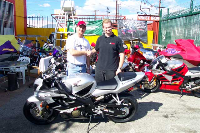 12\10\00: The 2000 GTP will be returned to me either tomorrow or Tuesday this week. Most of the modifications on the car have already been sold off and I may elect to sell the car earlier then previously thought. I went to a motorcycle convention yesterday where they debuted the new 2001 Honda F4i bike that I already have a hold on at a local dealer when it comes out Jan 15th.On the way back from the show I got a call from someone who had seen my ad for my current bike online and wanted to take a look at it. We met later that night and I found it quite odd that these 2 people where going over the bike with a fine tooth comb. Even stranger he offered to pay for the bike with cash and didn't need to talk price....he would take it for what I was asking. After the sale was completed I come to find out this bike is going to be used for a movie. Its called "Collateral Damage" and stars Arnold Schwarzenegger. The bike will be used for the chase scenes and another bike just like the one I had will be crashed it the movie. Arnold himself being a avid motorcyclist will actually ride my bike personally for 2 weeks before those scenes are shot to get used to the bike. Its to bad my bike had to be this famous AFTER I sold it but its exciting none the less. The bike was yellow and black but will probably have the badgeing removed and be mostly if not all yellow in the movie. I have a picture of the people from the studio who bought the bike here the guy on the right is actually the stunt man who will be doing the crash scenes. The Durango situation is almost cleared up and looks like I got out of this one for under $200.00 for new bumper\brackets and paint....wahoo. The bumper came painted flat black and everyone says it looks better that way but I think the rental car place would disagree here's a picture of it here. And finally all masked up and ready to be painted here.
